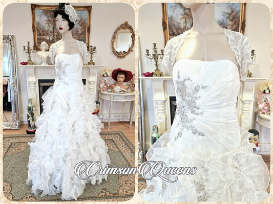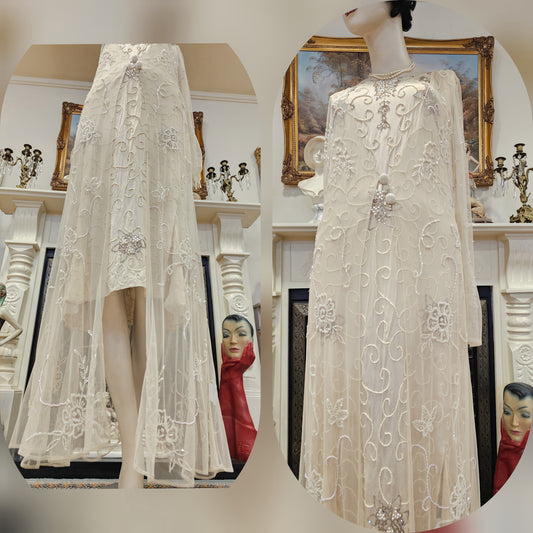 Vintage luxurious Art Deco edding Dress complete ensemble Embellished floral blossoming layer silk organza Ivory Size UK 10 US 6