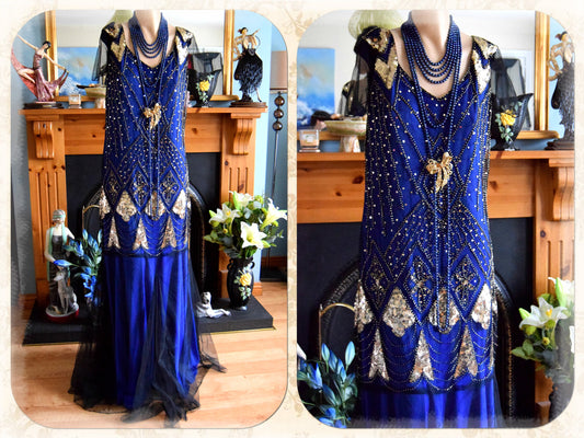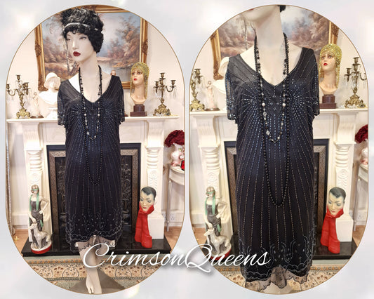Vintage Downton Abbey Great Gatsby black beaded mesh dress 1920s flapper ensemble with Art Deco Hobb's beaded duster size UK 16 US 12