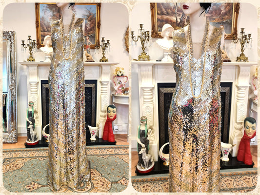 Extraordinary vintage illusion 1920s Art Deco Downton Abbey Hollywood goddess vintage silver maxi sequin shell dress gown size UK 12 US 8