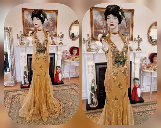 Spectacular one of the kind vintage 1920s 1930s Art Deco Peacock Queen sequined beads feathered lace gold dress ballgown size UK 6 8 US 2 4
