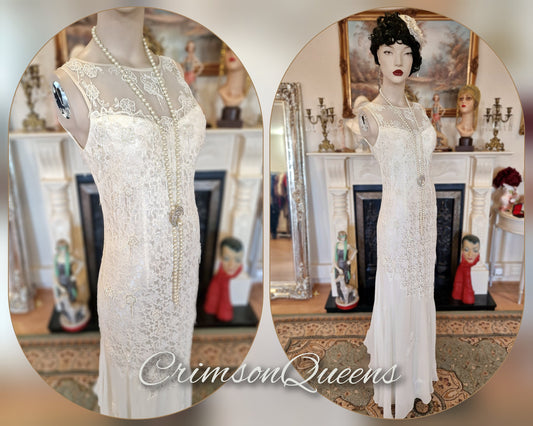 Art Deco vintage 1920s Downton Abbey bride off-white wedding bridal dress beaded flapper 100% silk Great Gatsby size UK 8 10 US 4 6