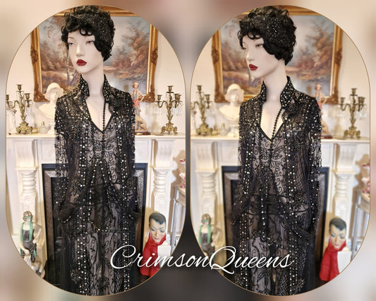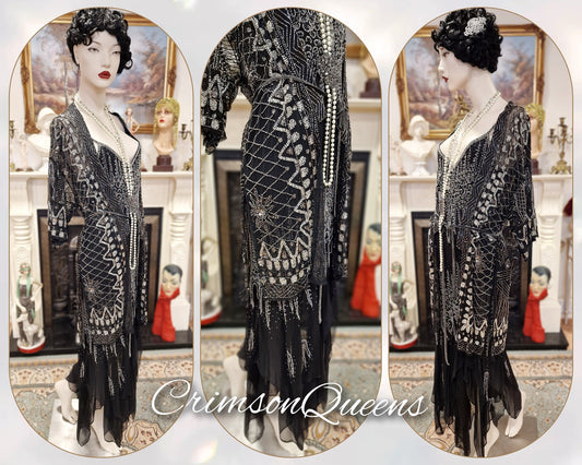Vintage Downton Abbey Great Gatsby black beaded sheer mesh dress 1920s flapper ensemble with Art Deco lace duster size UK 10 12 US 6 8