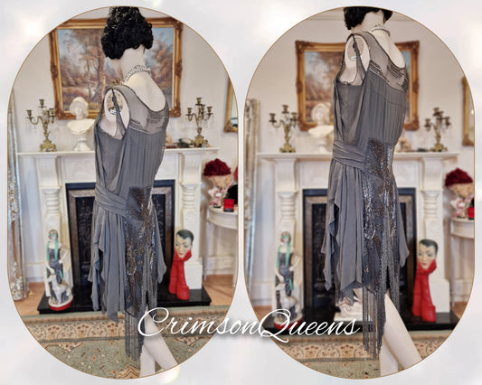 Vintage Art Deco flapper 1920s Great Gatsby Downton Abbey spectacular luxurious evening silver grey beaded tasseled dress size UK 10 US 6