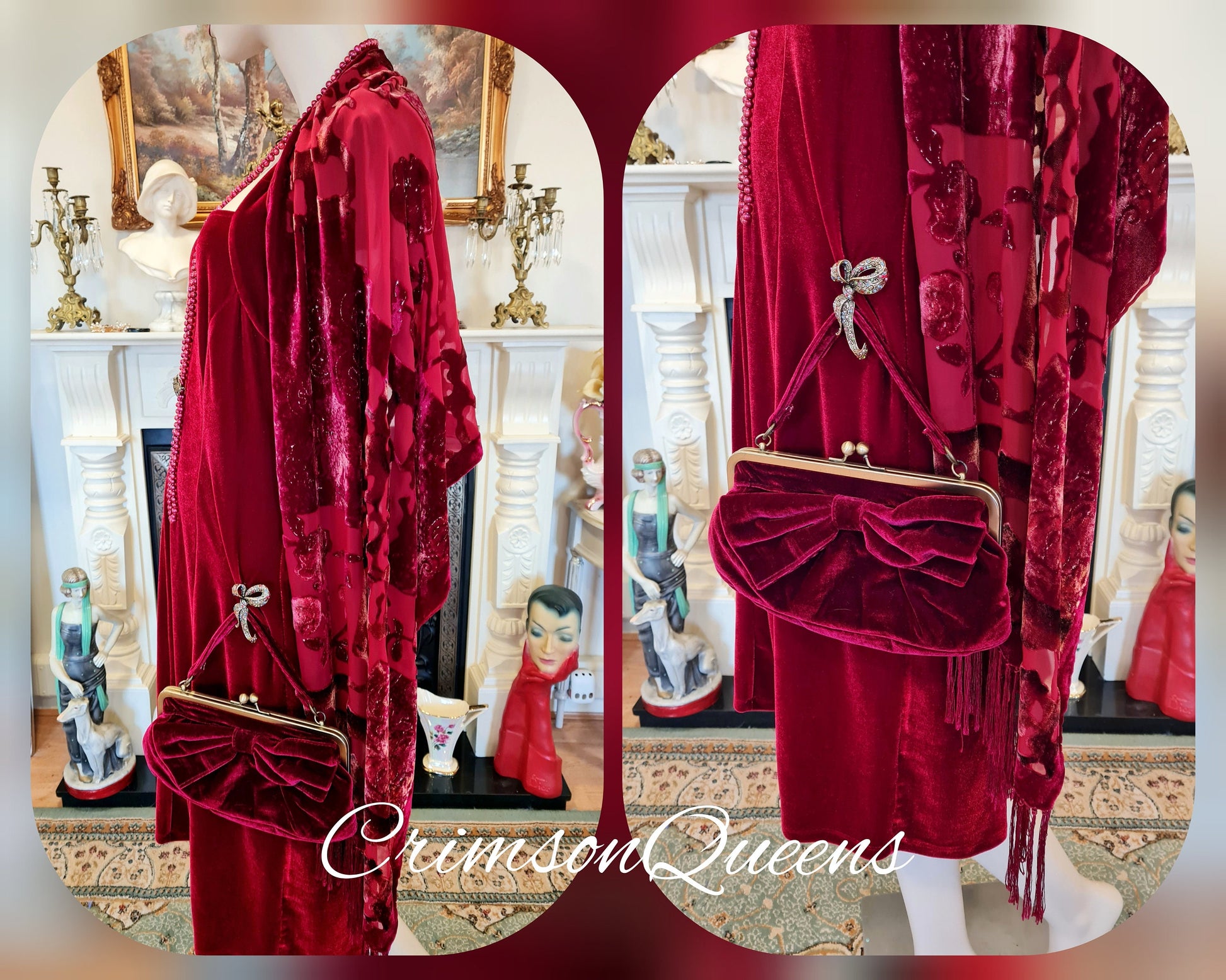 Extraordinary, so romantic, beautiful, Downtown Abbey style ensemble consisting of a velvet dress, velvet scarlet red bag, matching hat and silk Devore shawl. As a hair accessory there is a lovely headpiece included and a scarlet red natural freshwater pearl necklace to finish this super feminine look Very striking creation s o well thought over. . Truly recommend it. Dres is simply breathtaking...
