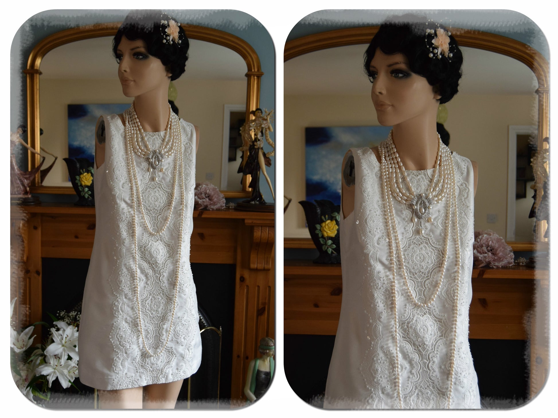 Charming white, soft mix of silk dress with panels of embellished lace on the fornt part. As you can see in the lace above, the pattern is very large. This featured dress has a romantic style is also very elegant and humble at the same time. Truly recommend for a vintage themed wedding or as a summer cocktail dress teamed up with lovely laces jacket with duck egg lining...Stunning... Dress has a concealed zip onside. The mannequin us size 12 and the dress is o tight on him.. Perfect for aperson with siez 164 to 170 cm with UK 8 size or US 4