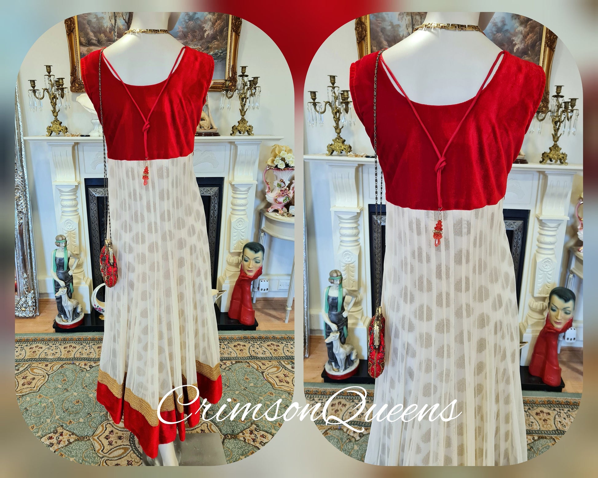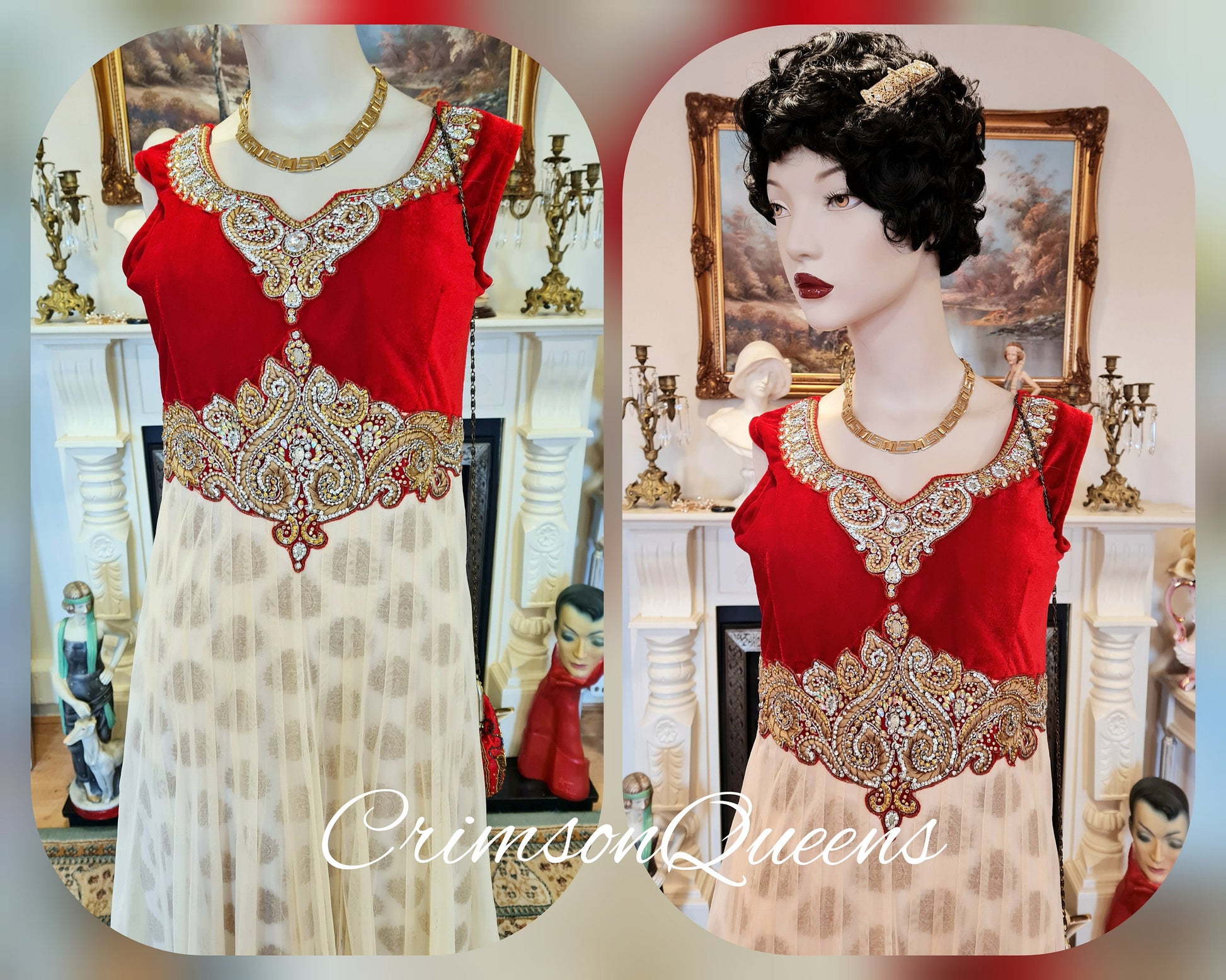 Part 2 of ohotos Bohemian romantic gypsy medieval  vintage scarlet red embellished beaded evening ballgown floor dress with matching long coat size UK 8 US 4