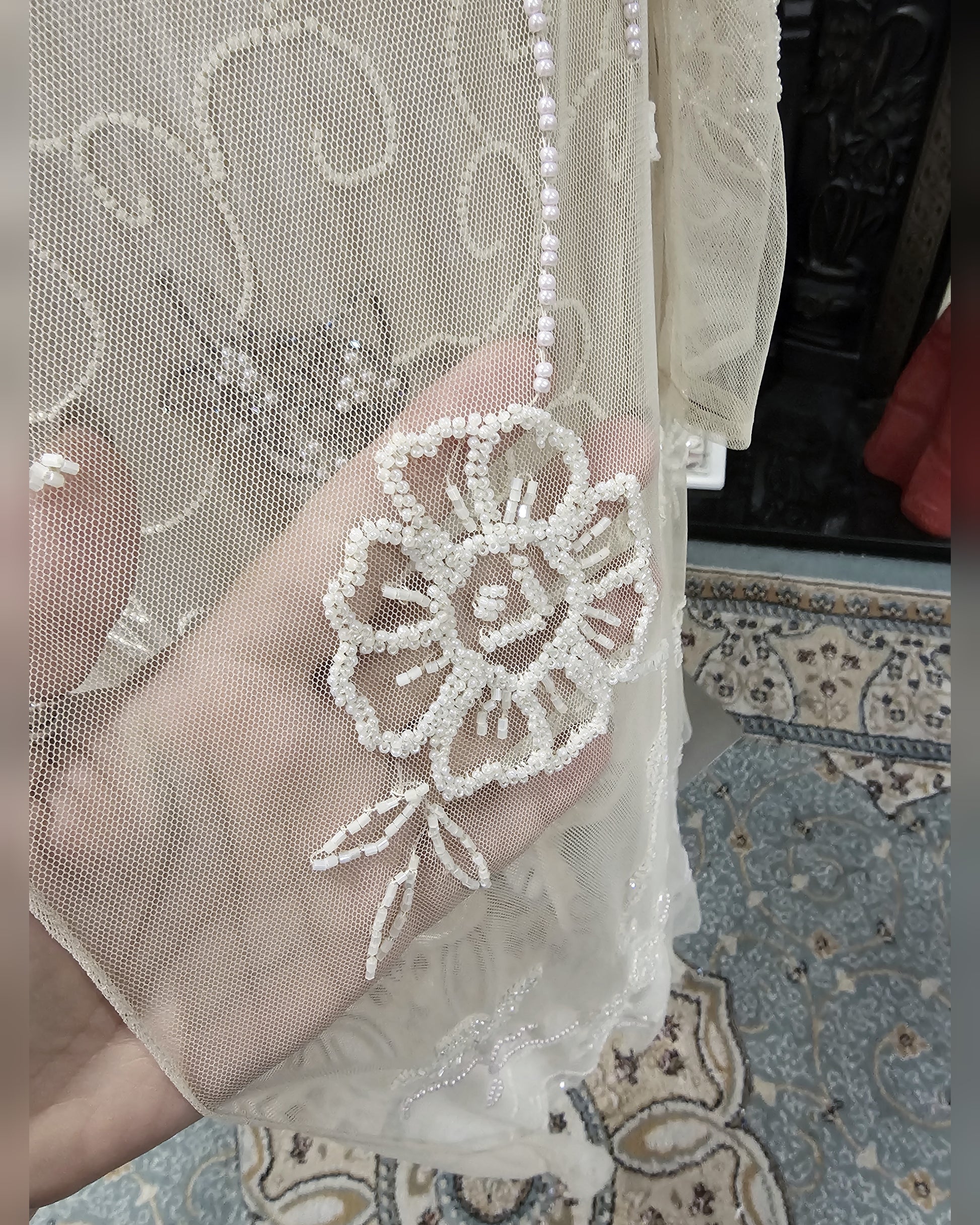 Outstanding, vintage bridal jacket made by Sue Wong. The wedding coat has an vanilla champagne shade and is made of soft cotton tulle adorned with beautiful frosted beaded borders and beautiful beaded embellishments scattered on the coat.An extraordinary garment for a special art-themed wedding ceremony. Such a pretty item in beautiful and clean condition! Can't recommend it enough. Pictures don't do justice to the beauty of the coat. It amazing in reality!