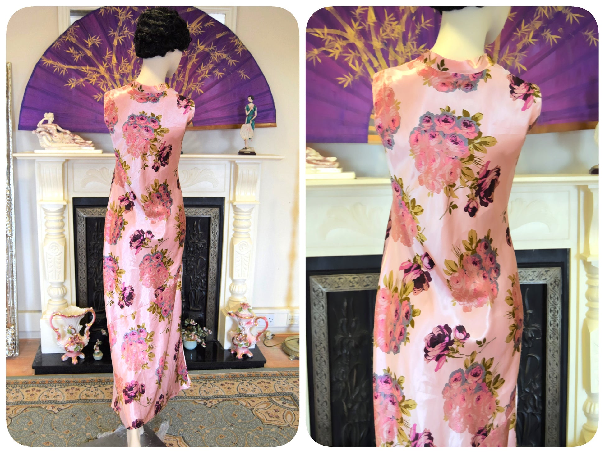 Oriental Silk Evening Gown Avant Garde Peach Pink Satin Floral Romantic liquid cocktail Down Dress Size UK 8 10 US 4 6