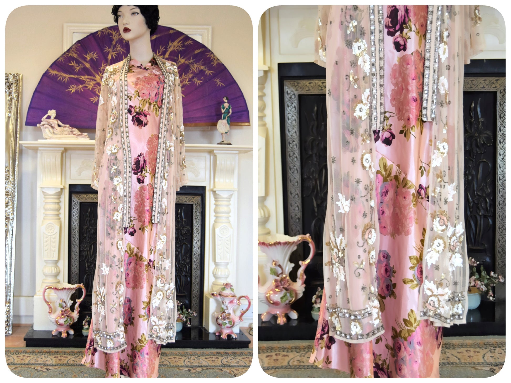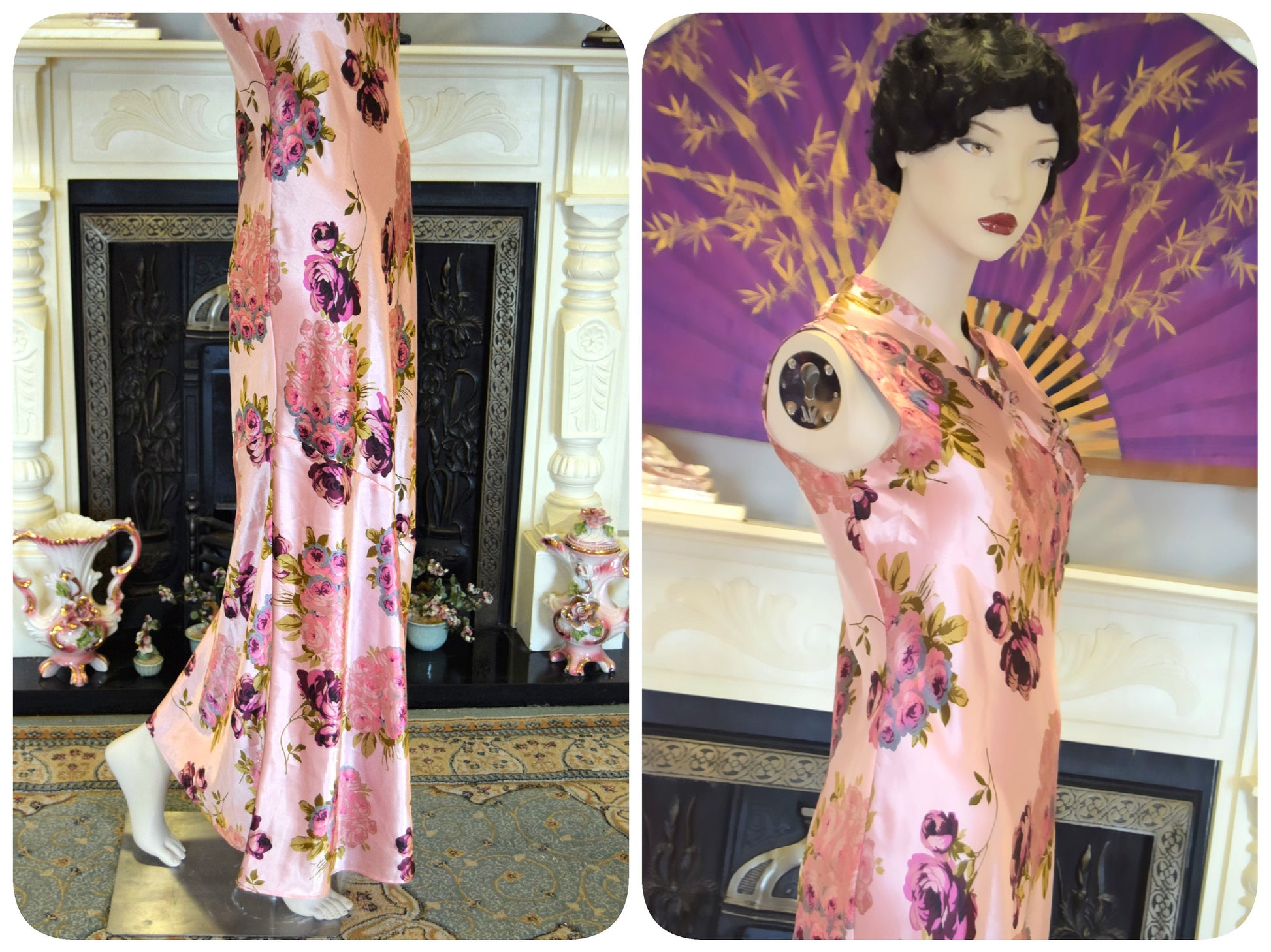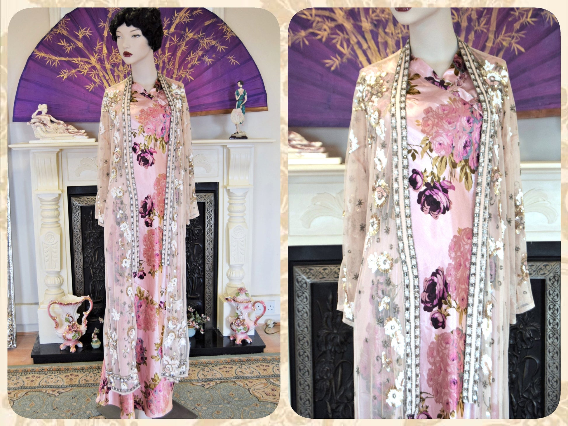 Beautiful and romantic, so delicate and mesmerizing 1930s cocktail style dress. Stunning, full of vintage charm dripping with elegance and luxuriousness. This dress is extremely well-made with every attention to detail. Gorgeous oriental, hand-painted on silk, floral motifs add a real uniqueness to this outstanding gown. This dress is made entirely of supreme quality, shiny silk t A lovely feminine dress that looks amazing on! Truly recommend! THe embellished sequinned kimono the dress is pictured with is also for sale. Please send me a message if you are interested!