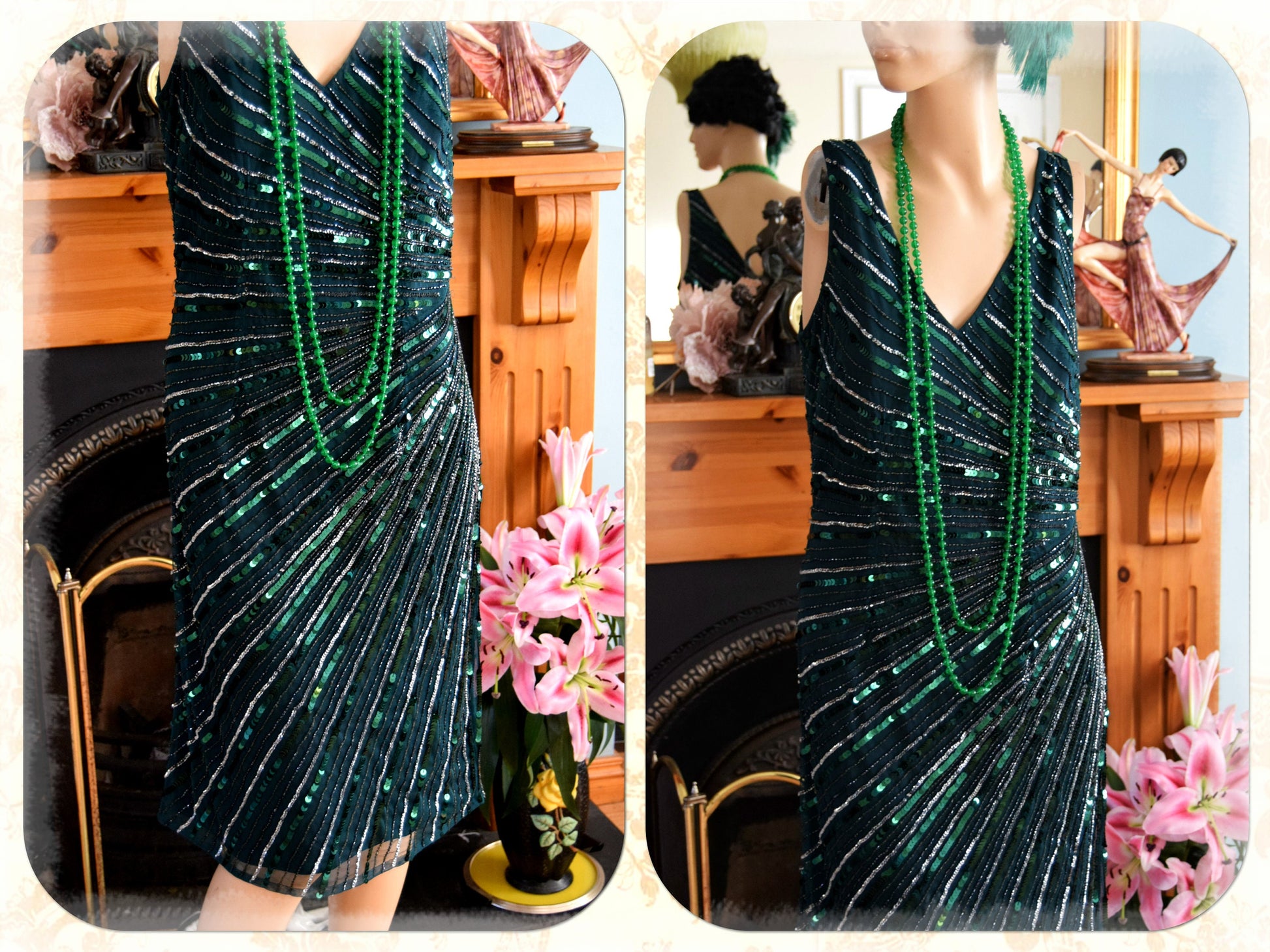 Vintage Bottle Green flapper Downton Abbey embellish bead 1920s sequinned charleston dress UK size 12 US 8